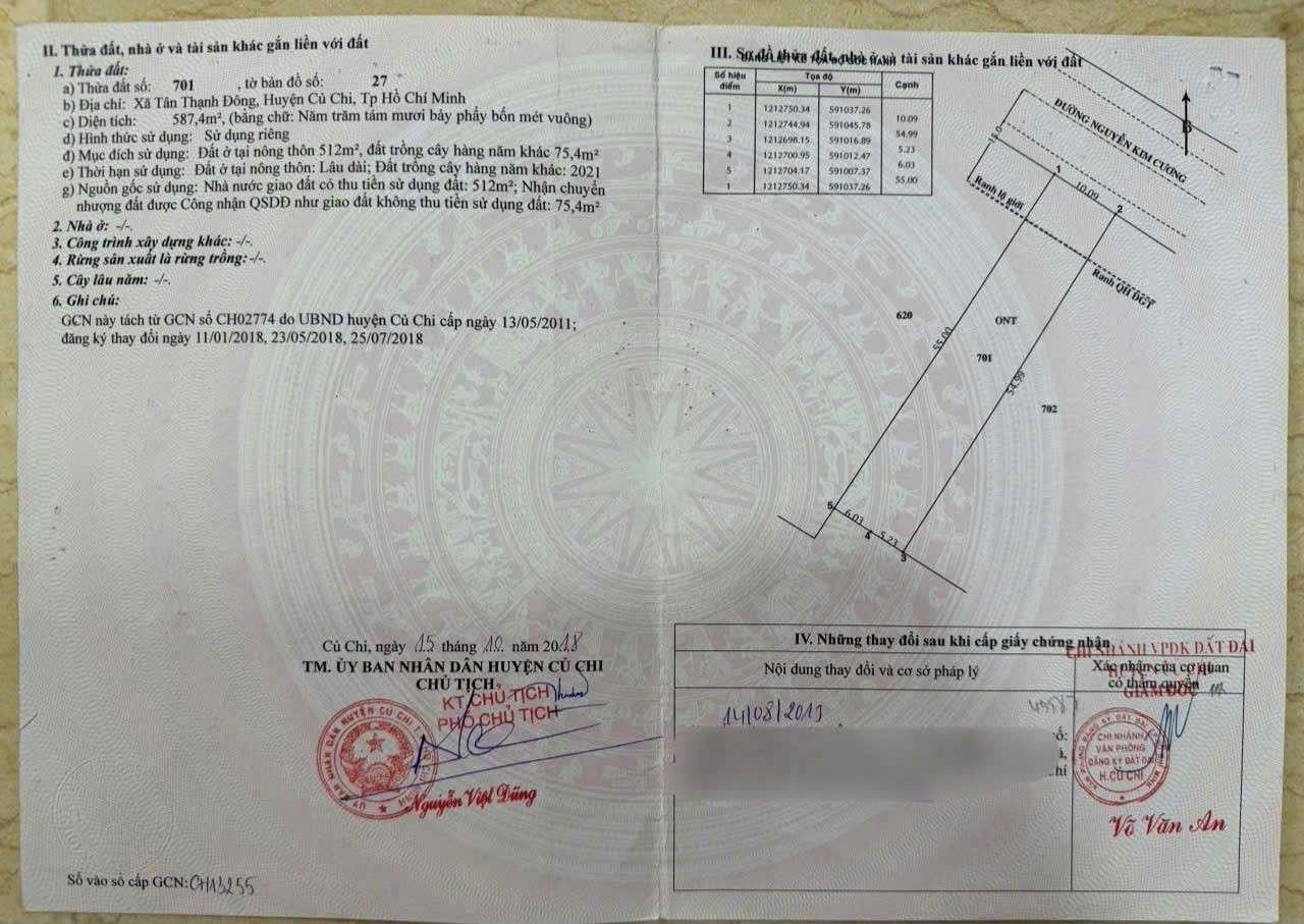 - Diện tích : 587m2m2 = 10m x 55m, thổ cư 512m2 (nở hậu 11m), đất ở khsx