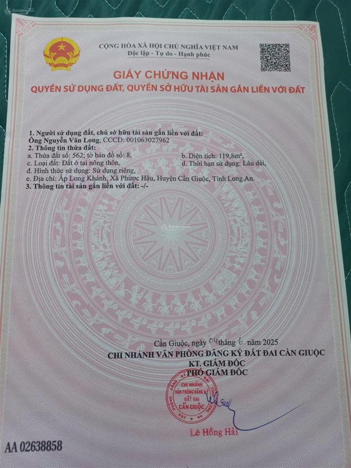 Bán 2 lô đất nền thổ cư liền kề tại Ấp Long Khánh, Xã Phước Hậu, Cần Giuộc, Long An với diện tích 119.8 m² & 118,5 m² với giá 900 triệu/ lô đất.