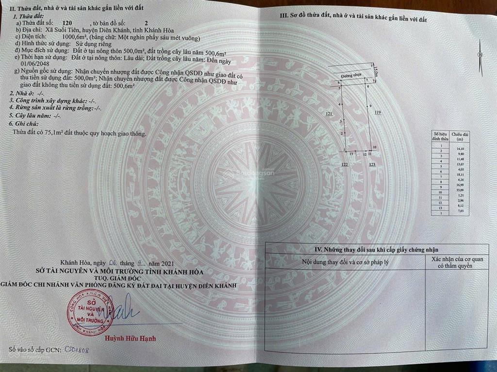Tổng diện tích: 1000.6m² (500m² thổ cư).