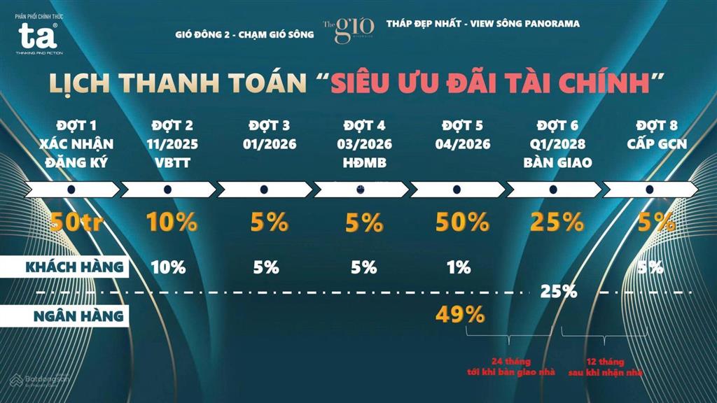 + Thanh toán thảnh thơi 5% mỗi 6 tháng, chỉ 30% đến khi nhận nhà, không vay.
