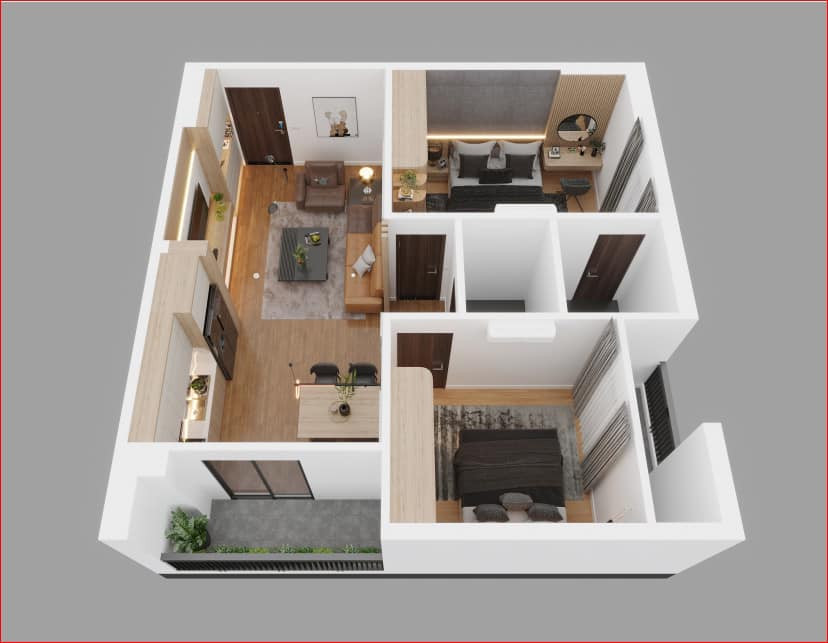 + Diện tích thông thủy 66 m2 thiết kế 2 ngủ 2 vệ sinh