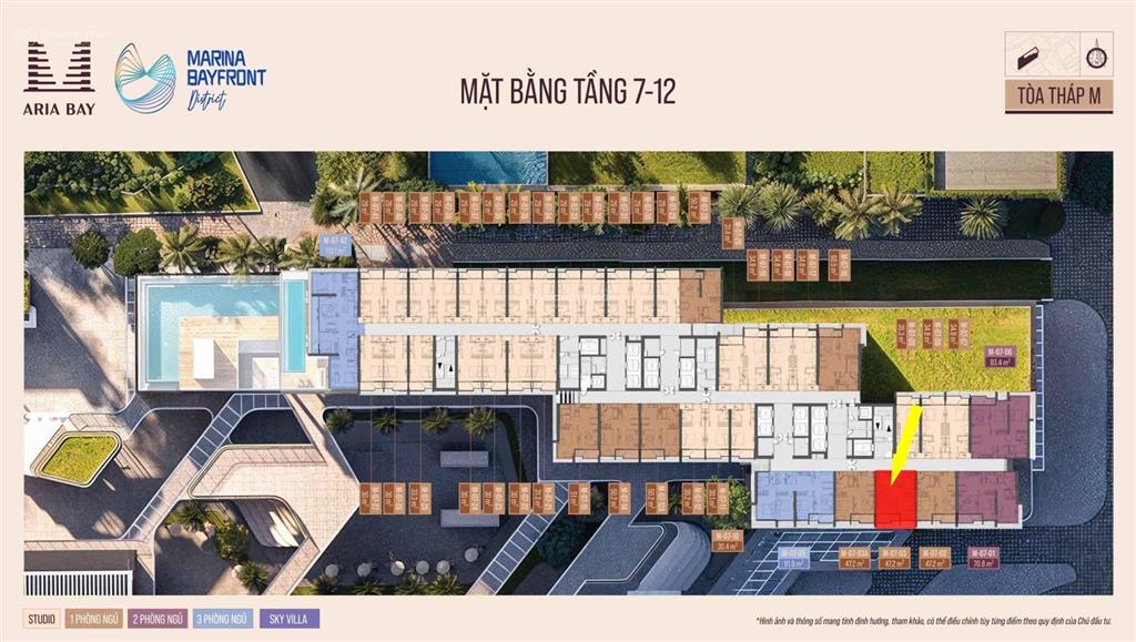Thiết kế: 1 phòng ngủ, 1 vệ sinh, bếp phòng khách liền mạch, ban công rộng view vịnh.