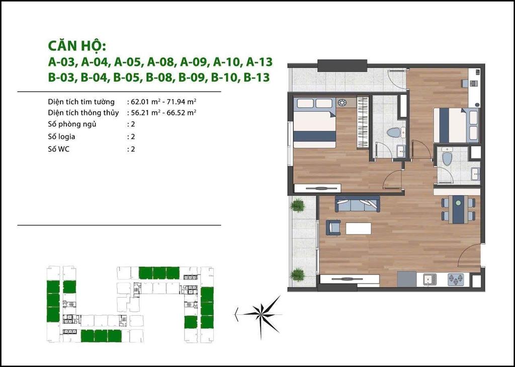 Tổng diện tích 7.302m², bao gồm 2 toà với tổng 852 văn hộ ở.