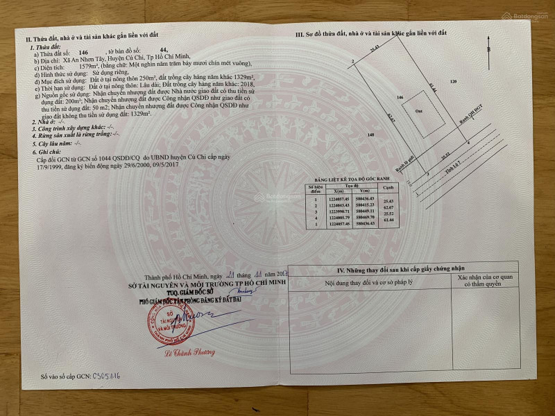 Diện tích đất 1579m², có sẵn 250m² thổ cư, quy hoạch khu dân cư hiện hữu.