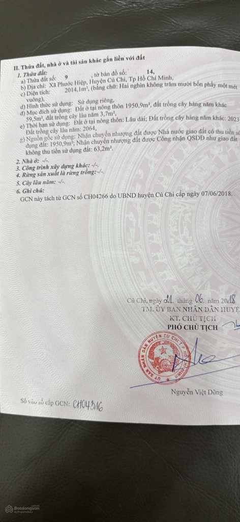 Cần tiền bán nhanh 2000m² đất 100% thổ cư. Đất đã san lấp ngang mặt đường. Đất gần thị trấn Củ Chi, gần ngay Quốc Lộ 22 cách 2 trường học chừng 1km. Hiện nay chuyển đất NN lên thổ cư rất nhiều tiền có khi tương đương tiền bán lô đất này. Vị trí thuận tiện cho đi lại. Có lợi thế lâu dài. Đất phù hợp làm của để dành, xây kho xưởng hoặc nhà vườn