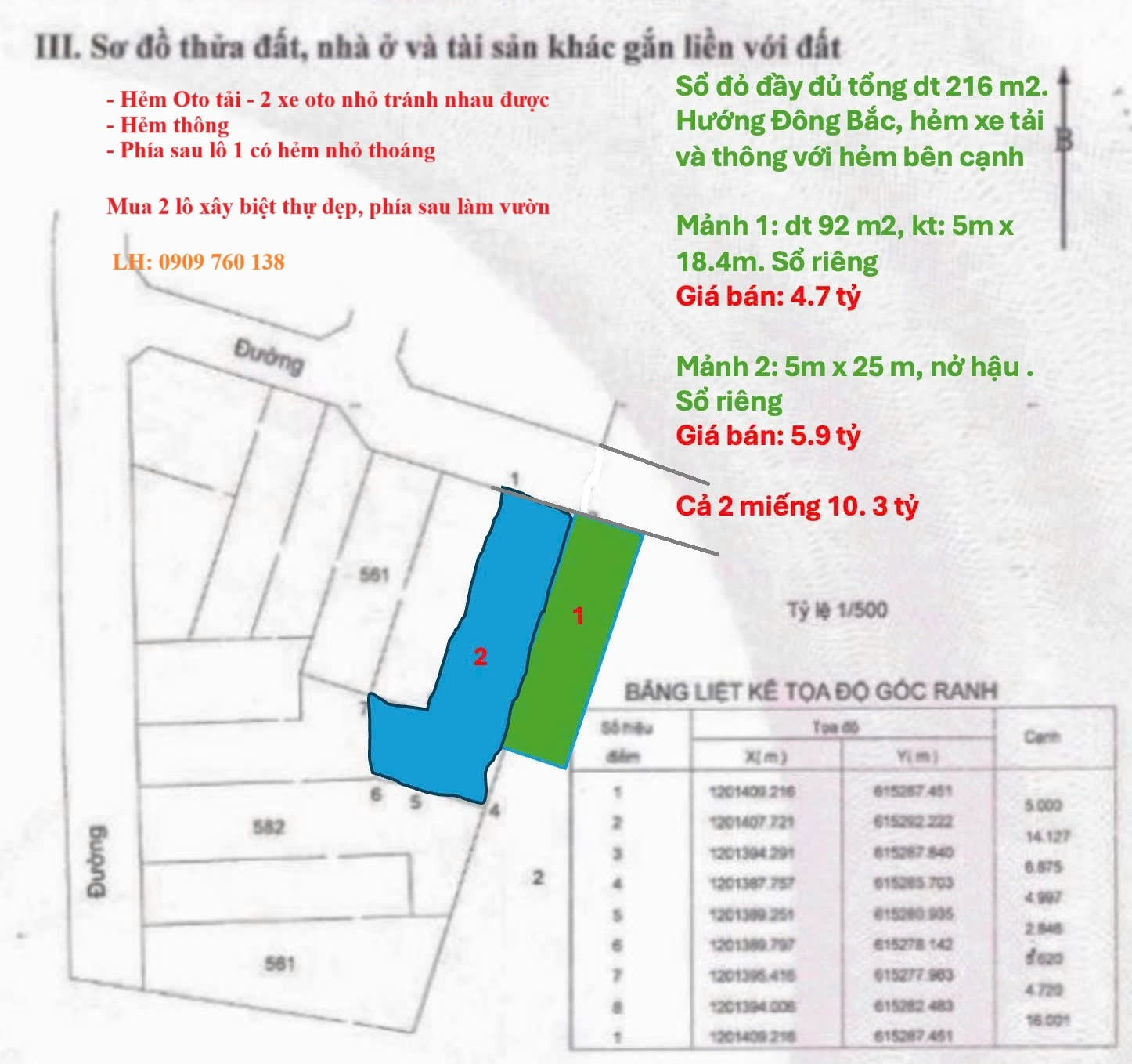 => hoặc cả 2 Lô = 216 m2 =10,3 tỷ ( Ngang 10 m2)
