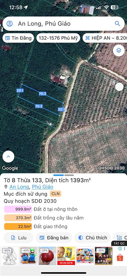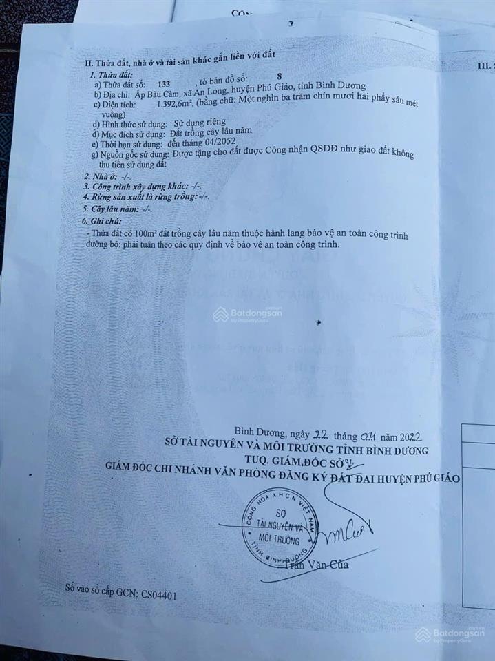 Đất nền diện tích lớn 1392m², vị trí thuận lợi tại xã An Long, Phú Giáo, Bình Dương (Cũ) nay là xã An Long - TP Hồ Chí Minh.