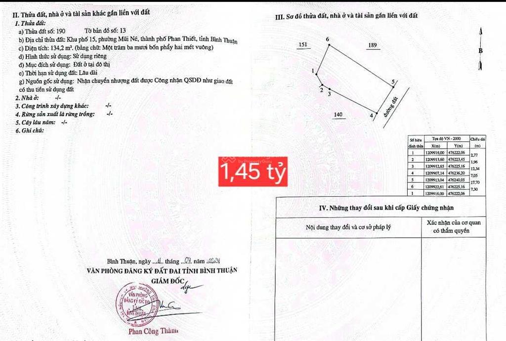 Cần bán đất hẻm Huỳnh Tấn Phát, Mũi Né, Phan Thiết. Gần ngay ngã 3 Huỳnh Thúc Kháng, chợ Mũi Né. Khu vực hiện tại du lịch đông đúc, hàng quán, khách sạn... DT 134m² (thổ cư) ngang 7,05m dài 17.7m, nở hậu. Giá 1,55 tỷ.