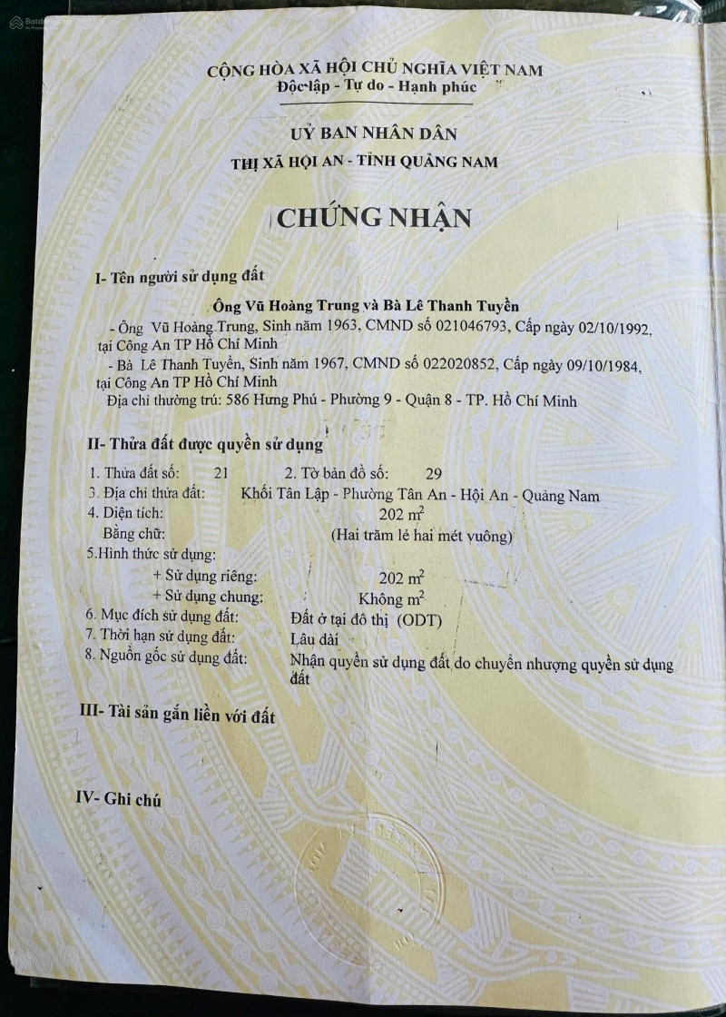 Diện tích: 202m2 đất ODT