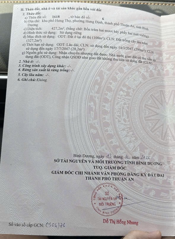 - DT: 10x43m = 427m2 / thổ cư 100m2