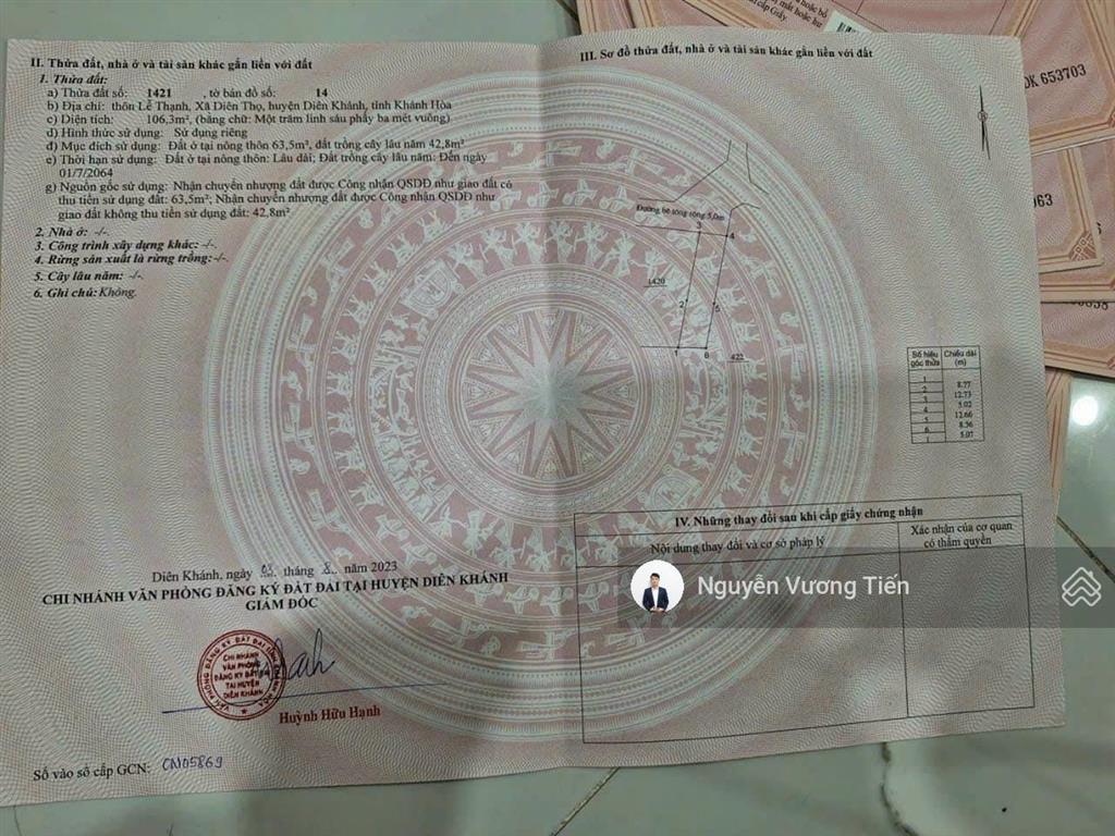 Diện tích: 106,3m² (63,5m² đất ở, 42,8m² đất trồng cây lâu năm).