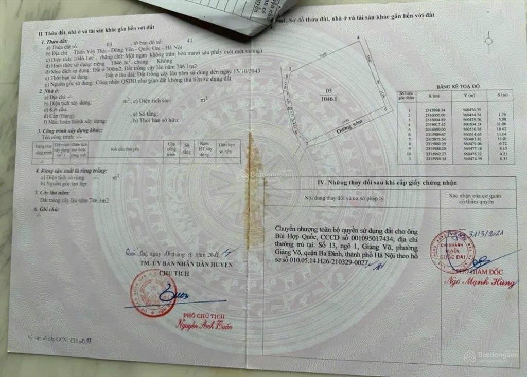 Đất nền cực chất ở thôn Yên Thái, xã Đông Yên, Huyện Quốc Oai, Hà Nội. Với diện tích 1046m² thì có tới 850m² thổ cư, lại còn là lô góc 3 mặt tiền, sổ Hồng có sẵn,