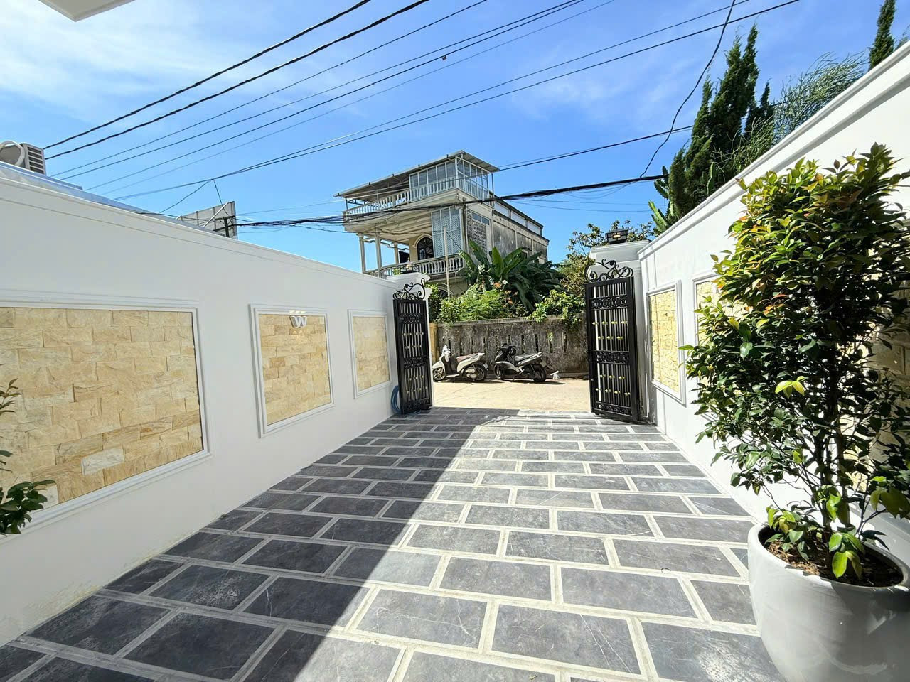 - Sân trước đậu ô tô 4–7 chỗ, xe 16 chỗ đậu thoải mái trước nhà