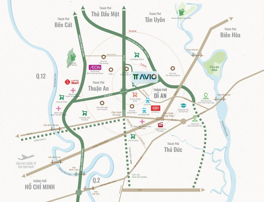 Với vị trí trung tâm Dĩ An, từ TT Avio có thể dễ dàng di chuyển tới Vincom Dĩ ạ( chỉ hơn 1km). Chỉ 2 tới 10 phút di chuển là tới KCN Sóng Thần 1, KCN Sóng Thần 2, BVQT Becamex, BV Quân Đoàn 4, Ga Dĩ An, Trường Mầm Non, Trường Tiểu Học, UBND TP.Dĩ An,....