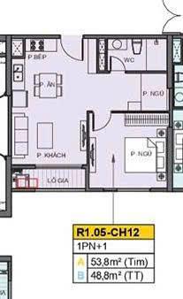 Căn hộ 1PN + diện tích 48.8m² - Có thể thiết kế thành 2PN.