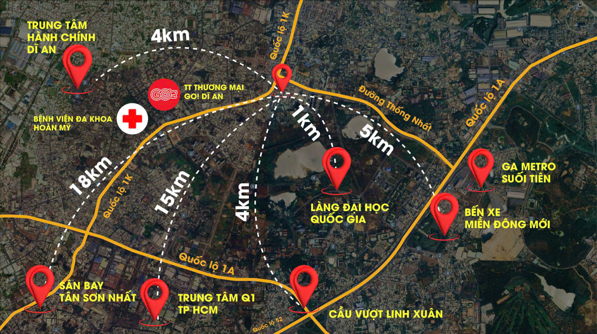 - Giao điểm vàng với trục đường huyết mạch: Quốc lộ 1K – Đại lộ Thống Nhất – Xa lộ Hà Nội.