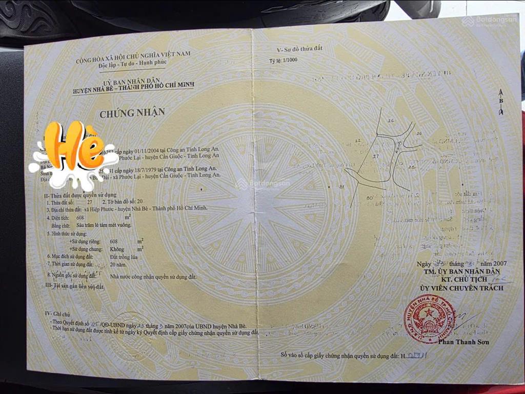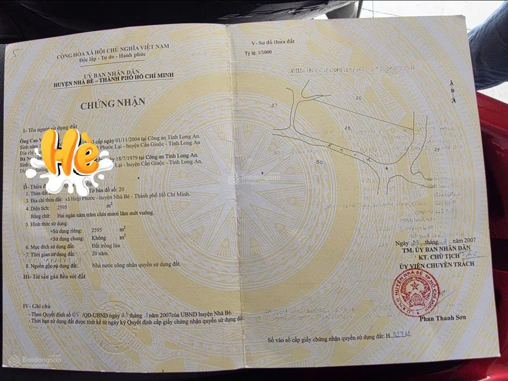 Vị trí: Đất nằm gần đường Liên ấp 3 - 4, xã Hiệp Phước, huyện Nhà Bè, khu vực đang phát triển mạnh nhờ các dự án hạ tầng và khu công nghiệp mở rộng.
