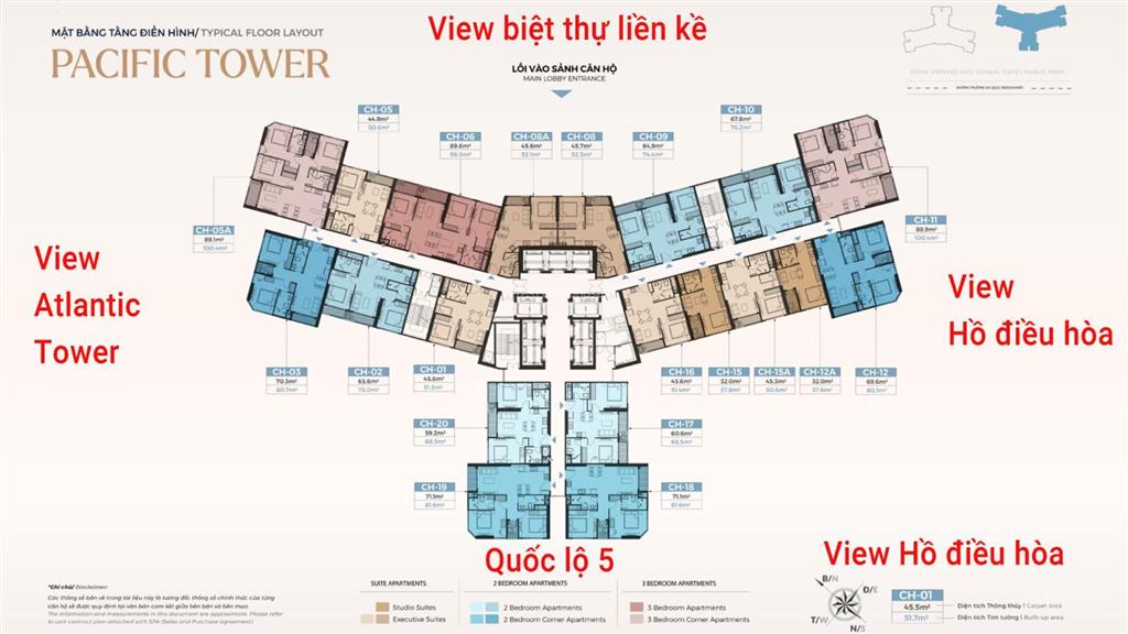 toà M1 tầng 2x căn 01 thiết kế 2 ngủ Diện tích 75,7m2 Hướng ĐN - ĐB