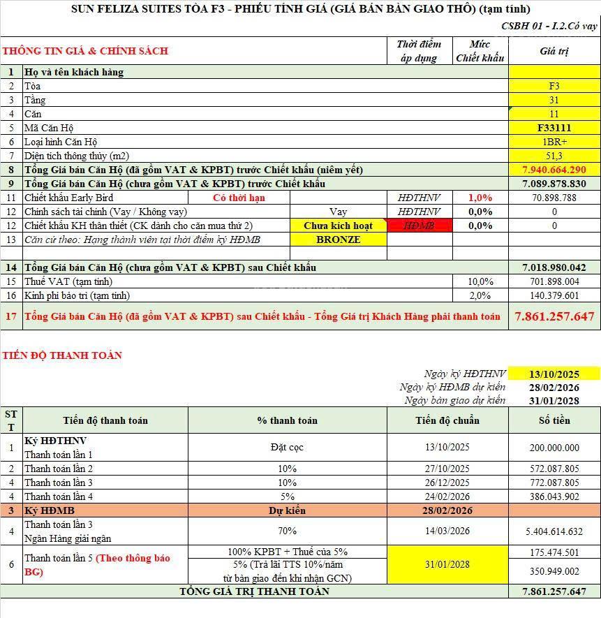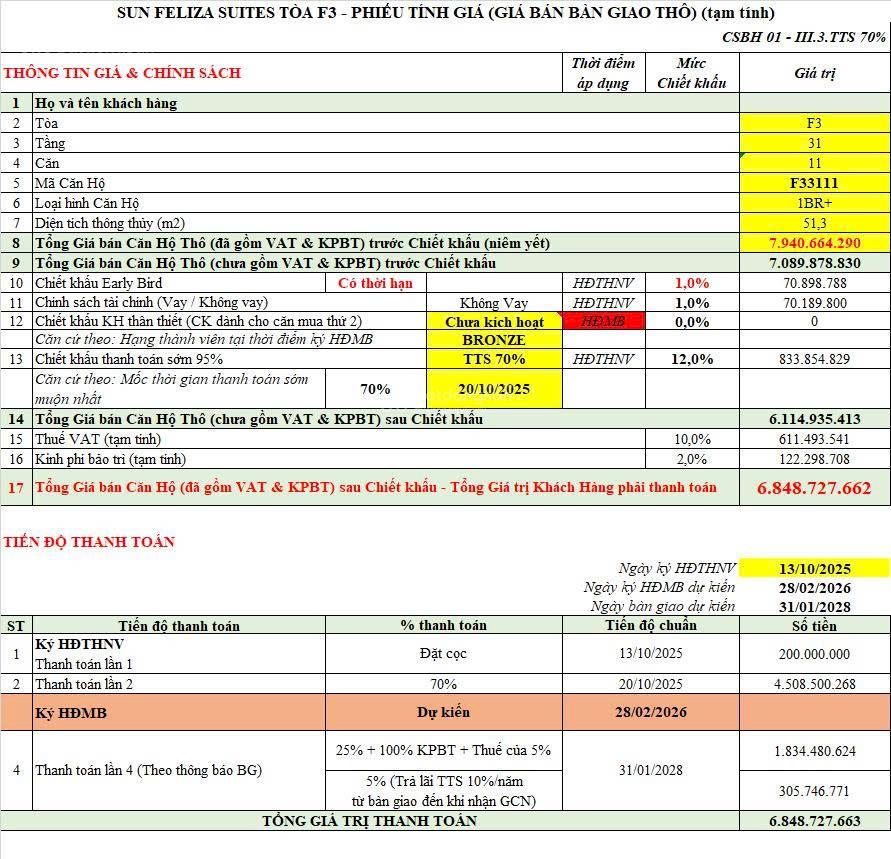 Chính chủ cần bán căn hộ 1 ngủ + 1 toà F3 Sun Feliza Suites, giá TTS chỉ từ 6,4 tỷ/ 7.8 tỷ.