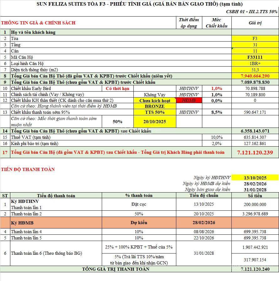 Khách hàng mua có thể lựa chọn các phương thức thanh toán 95%, 70%, 50%, tiến độ tiêu chuẩn và vay 70%.