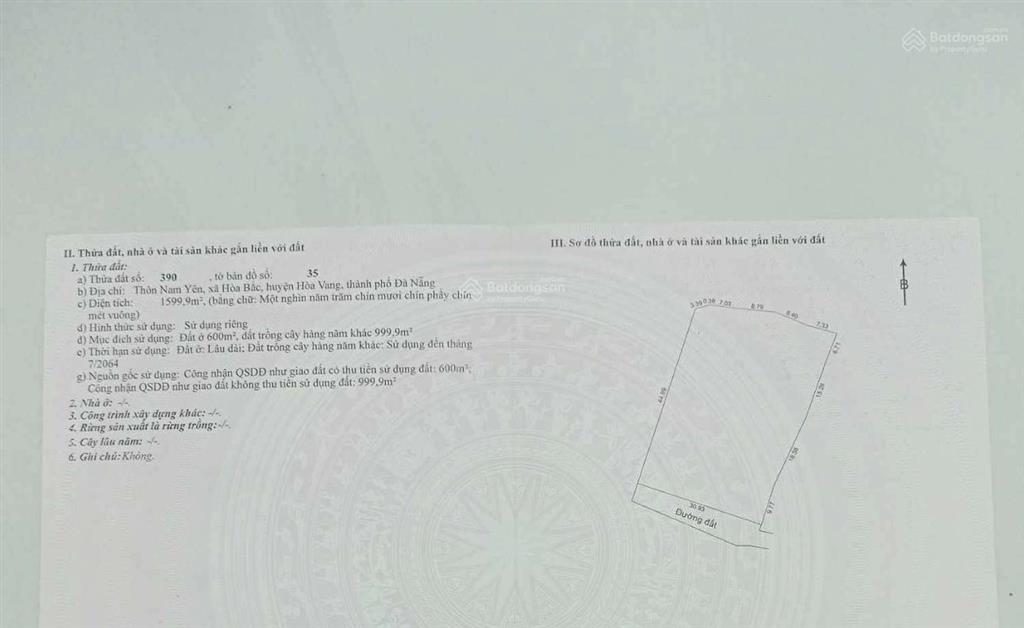 Diện tích: 1.600m (trong đó 600m đất ở lâu dài pháp lý rõ ràng, sổ hồng chính chủ), có 3 đường bê tông đi vào lô đất.