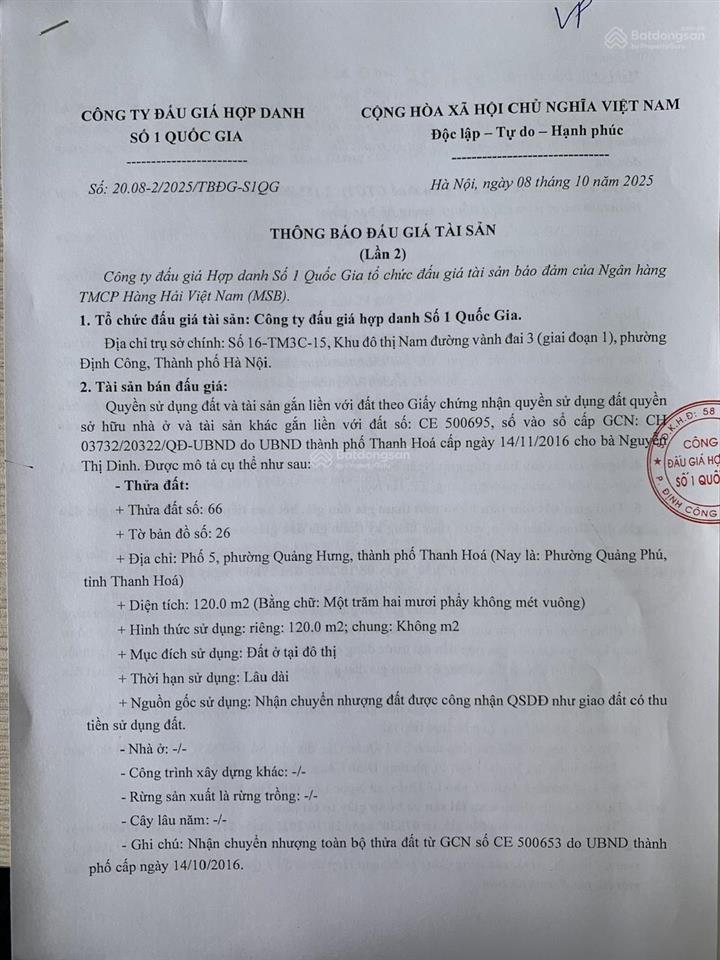 Quyền sử dụng đất và tài sản gắn liền với đất theo Giấy chứng nhận quyền sử dụng đất quyền sở hữu nhà ở và tài sản khác gắn liền với đất số: CE 500695, số vào sổ cấp GCN: CH 03732/20322/QĐ - UBND do UBND thành phố Thanh Hoá cấp ngày 14/11/2016 cho bà Nguyễn Thị Dinh. Được mô tả cụ thể như sau: