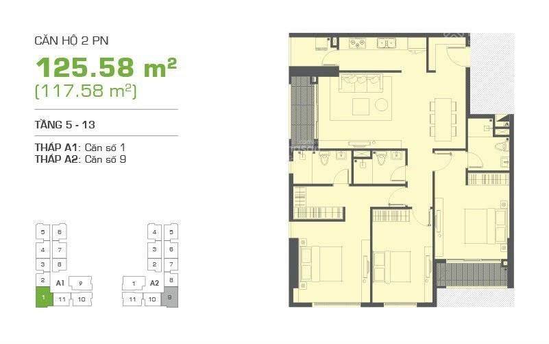 - Thiết kế: 3 phòng ngủ, 2 toilet, bếp + sân phơi, phòng khách, 2 ban công (ban công phòng khách & master room).