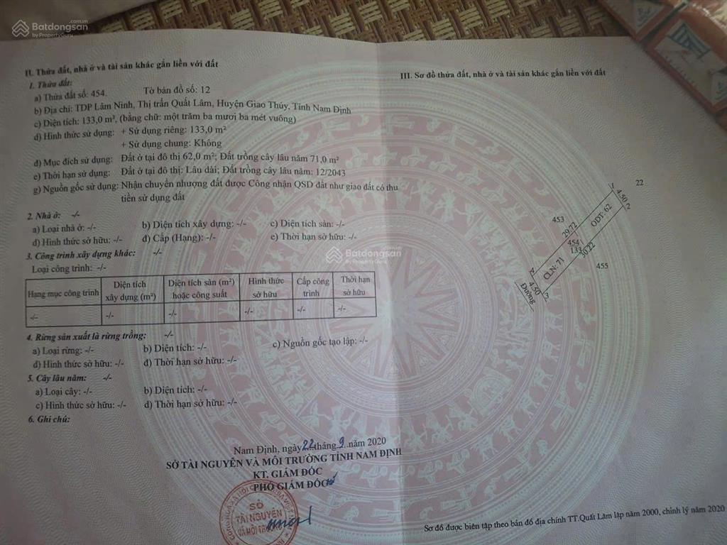 Do chuyển đổi công việc, gia đình tôi cần bán mảnh đất cha ông để lại diện tích: 133m² tại thị trấn Quất Lâm, Giao Thủy, Nam Định. Đất của tôi sẵn sổ đỏ chính chủ, sang tên được luôn.