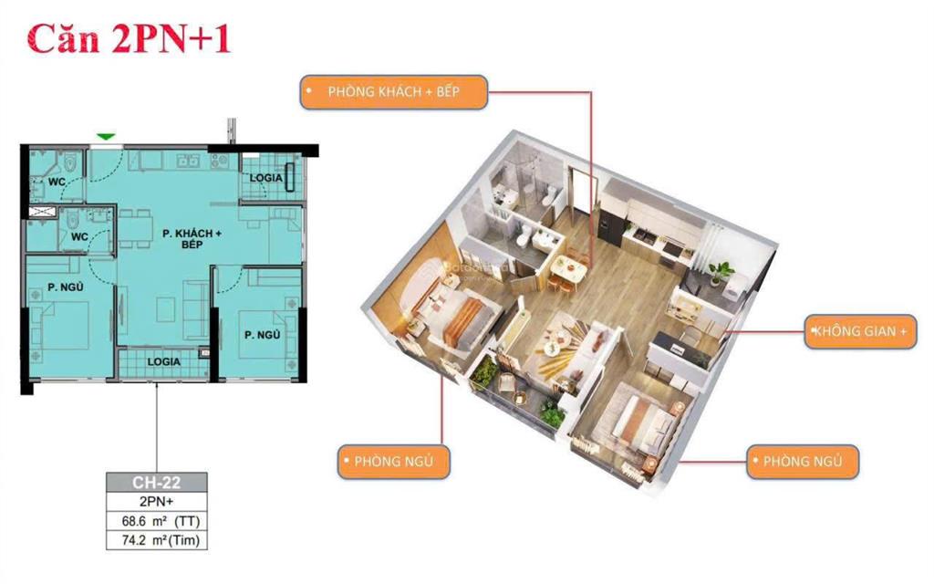 - Diện tích: 74m², thiết kế 2PN + 1 đa năng (phòng làm việc/để đồ).