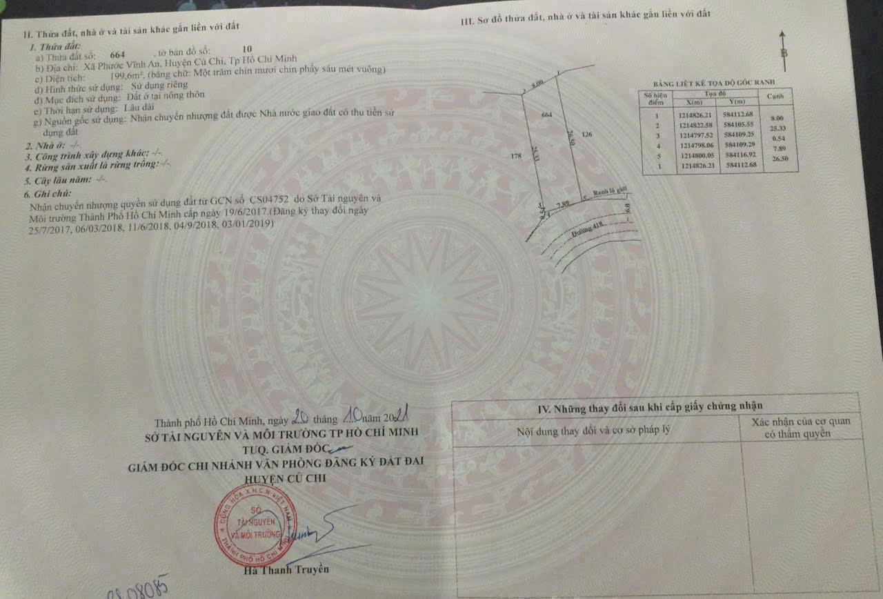 - Diện tích : 200m2 = 7m x 26m, (nở hậu 8m), full thổ cư, đất ở hiện hữu. Đất cách Tỉnh Lộ 8 khoảng 200m, đường thông, dân cư đông. Đất đã xây tường kiên cố, làm cổng