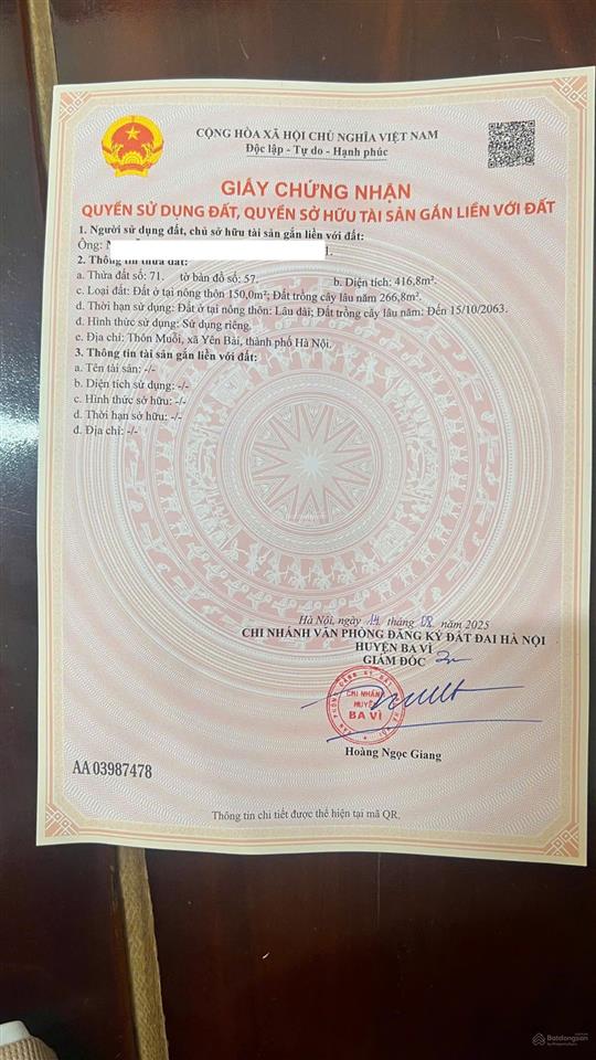 - Diện tích 416,8m², có 150m² đất ở, còn lại là đất trồng cây lâu năm.