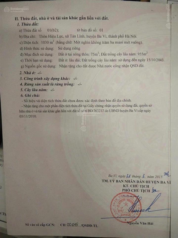 - Diện tích 1030m², có 75m² đất ở, còn lại là đất trồng cây lâu năm.