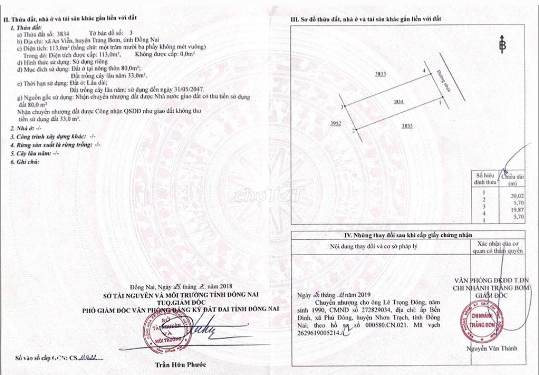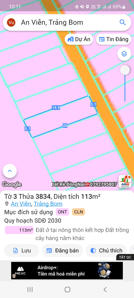 * Tờ 3/3834: 5,7 x 20m = 113m2 đất ONT 80m2