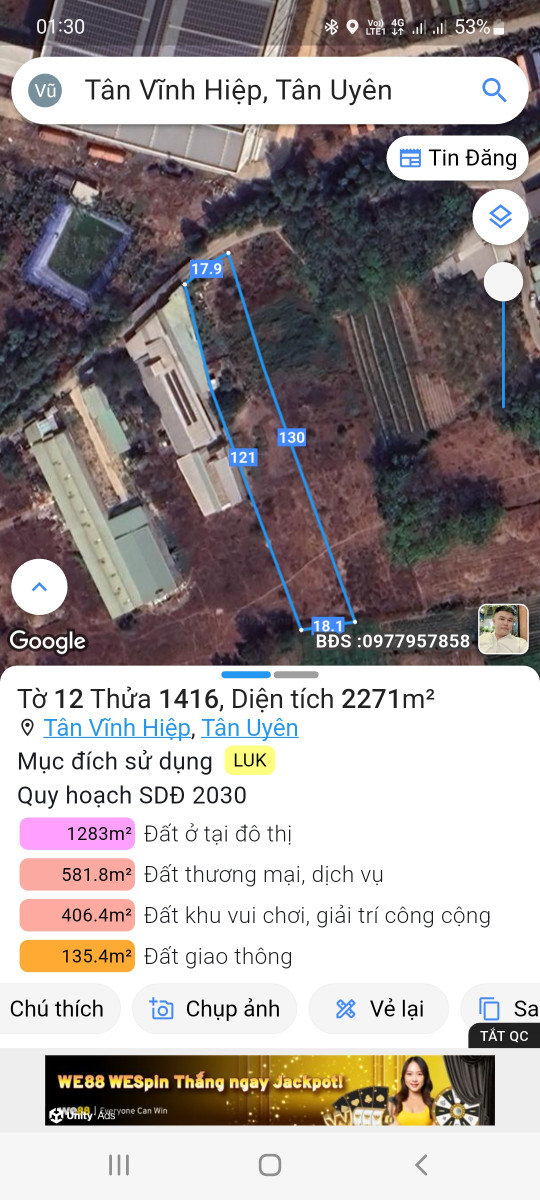 * Tờ 12/1416: 18 x 121m = 2271m2 đất ONT 545m2