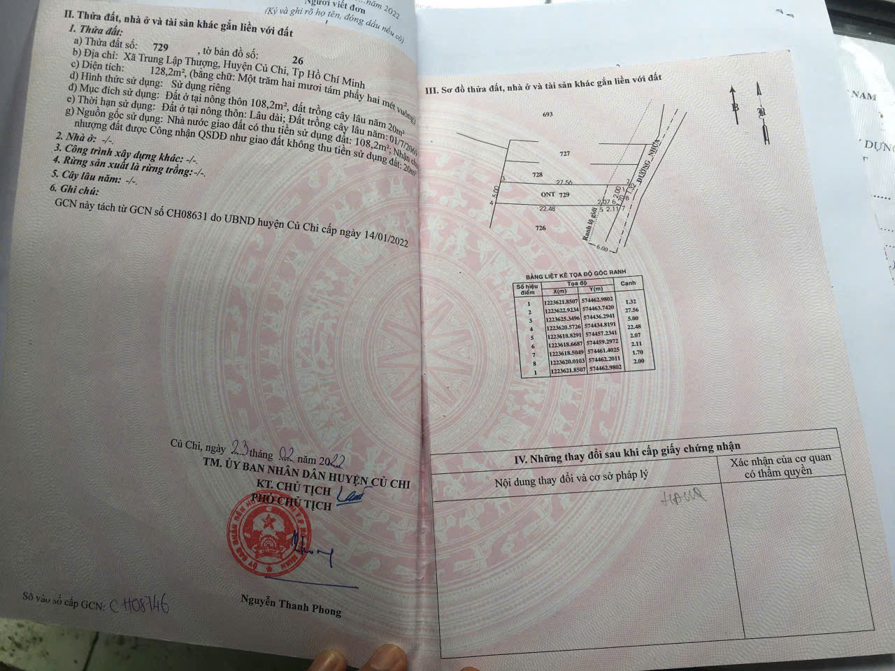 - DT: 128m2 = 5m x 25m, thổ cư 108m2, đất ở hiện hữu.