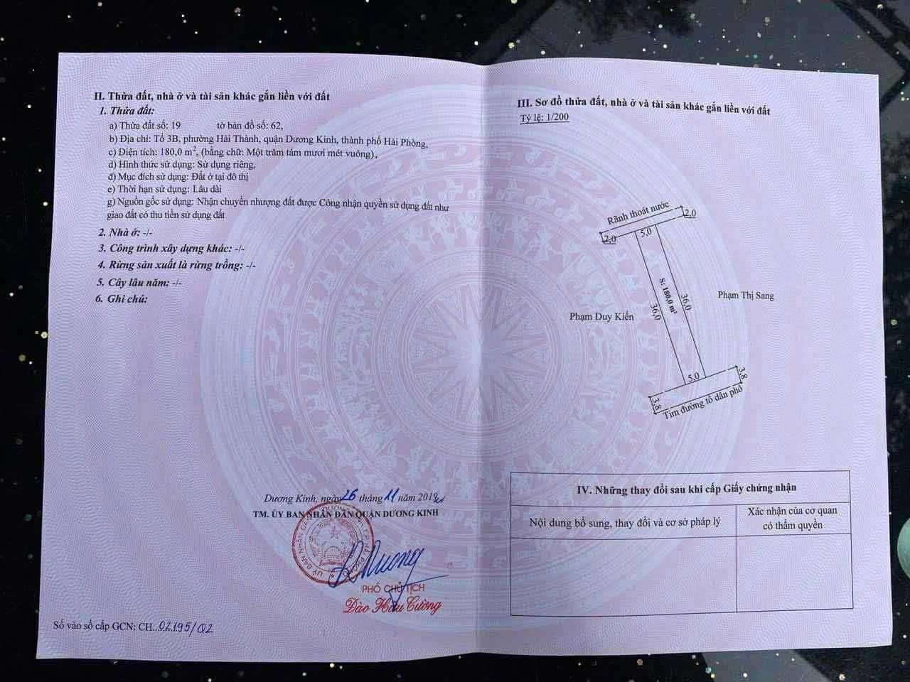 -Diện tích: 180m² (ngang 5m, sổ đỏ chính chủ)-Mặt tiền đẹp, đất vuông vắn, hướng phong thuỷ tốt-Đường trước đất: Nhựa 7,5m quy hoạch chuẩn, vỉa hè đầy đủ, ô tô tránh nhau thoải mái-Vị trí: Trung tâm phường Hải Thành – cách đường 353 Phạm Văn Đồng chỉ vài trăm mét-Tiện ích: Gần chợ, trường học, ủy ban, khu dân cư đông đúc, kinh doanh cực tốt-Pháp lý: Đất ở đô thị 100%, sẵn sổ trao tay, không dính quy hoạch-Giá: Chỉ 2x triệu/m² – hàng cực hiếm khu trung tâm Dương Kinh-Tiềm năng: Mặt đường chợ – vị trí vàng cho kinh doanh, cho thuê hoặc xây nhà phố thương mại, thanh khoản cao