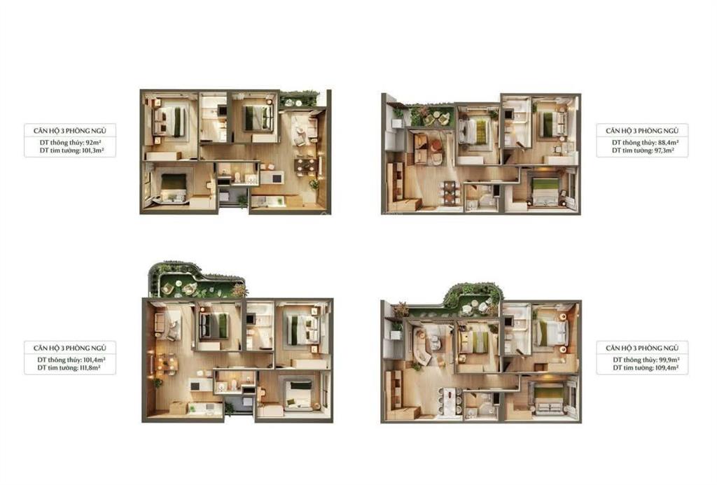 Diện tích rộng rãi 97m², 103.27m², 115m², bố cục hợp lý, layout mở, các phòng thông nhau tạo cảm giác gần gũi, ấm cúng mà vẫn rất riêng tư.