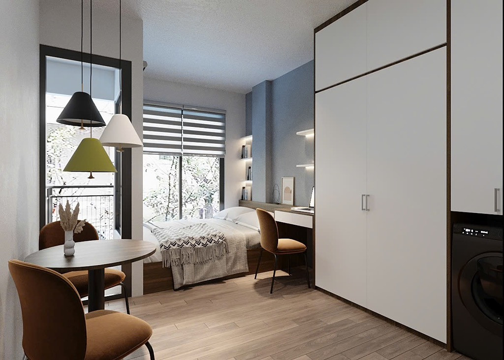- Nhà cao 8 tầng với tổng 32 phòng khép kín cao cấp chuẩn khách sạn 6 sao. Tất cả các phòng đều có ban công thoáng sáng và máy giặt riêng